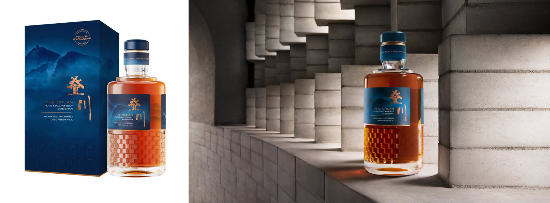 这款免税限定版的瓶身与外包装设计融入了中国水墨写意画面,以山峦之蓝勾勒峨眉山景与流水意象,同时用寓意“光与影”的砖块图纹巧妙呼应叠川酒厂标志性建筑“品川阁”,将传统美学与现代设计语言相融合,传递叠川酒厂所在之地峨眉的本地风土形象。除此之外,免税限定版更加以定制旅行标签精致点缀,是旅行家们旅途中用以纪念或赠礼的理想选择。